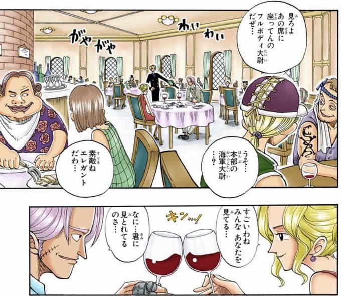 「見ろよ、あの席に座ってんのフルボディ大尉だぜ」 「素敵ねエレガントだわ」 「すごいわね、みんな貴方を見てる」 「なに君に見とれてるのさ」 2人は乾杯をし、ワインに口をつけた 「シャイン軍曹*、フルボディ、ジャンゴ ガープ中将 コビー、ヘルメッポ 巻四十四まで スモーカー准将 たしぎ少尉、マシカク軍曹* 巻六十五まで スモーカー大佐 たしぎ曹長、マシカク軍曹* 巻四フルボディ 海軍本部大尉→海軍本部三等兵。 現在はヒナの部下。 ナックルダスターがトレードマーク(初期は右手のみ。 後に左手にも装着)。 サンジには手も足も出なかったが、その実力は